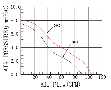 | PART NO. | V DC | Hz | A mp | Watt | R.P.M | m³/min | CFM | mmH2O | INH2O | dB-A |